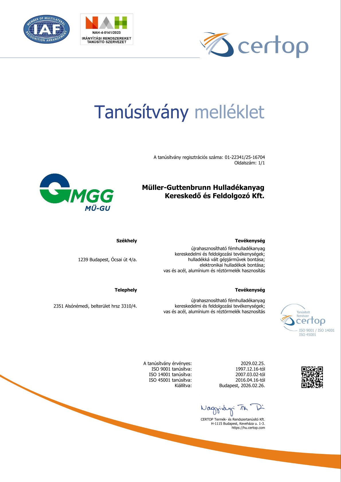 Tanúsítvány és melléklet: ISO9001, ISO14001, ISO 45001